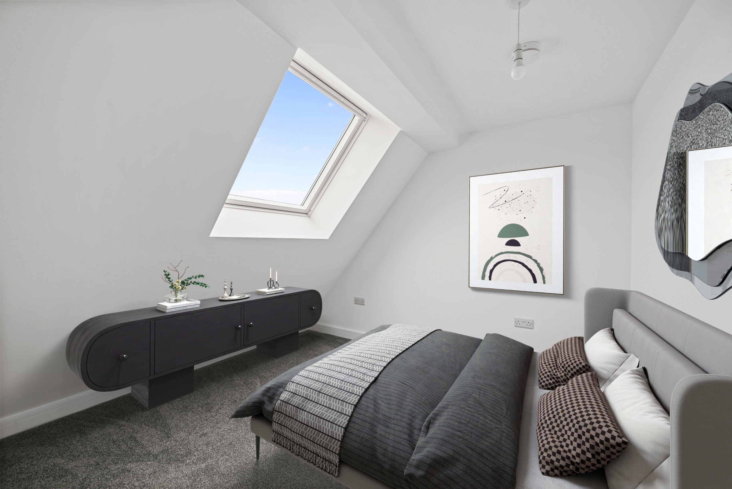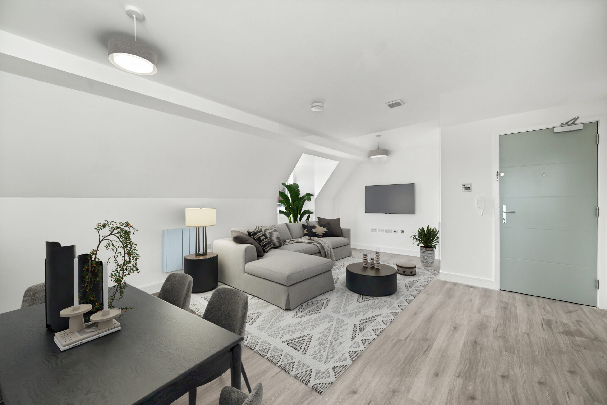 • Matt black switches and sockets, and grey-painted skirtings & architraves for a modern, refined look