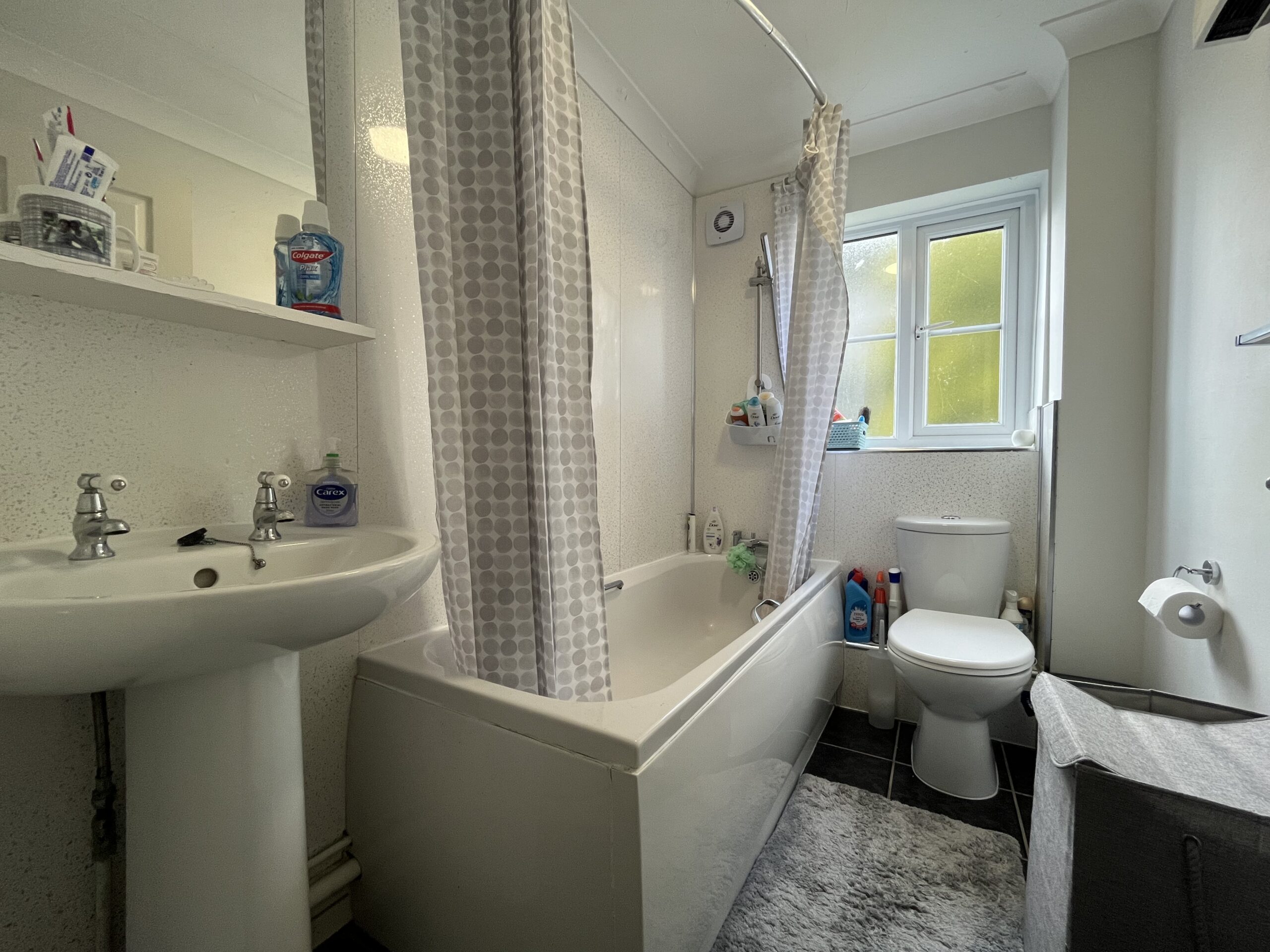 Fitted three piece suite comprising; Bathtub with shower attachment over, WC and wash handbasin. Double glazed to the rear, tiled flooring, extractor fan and radiator.