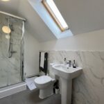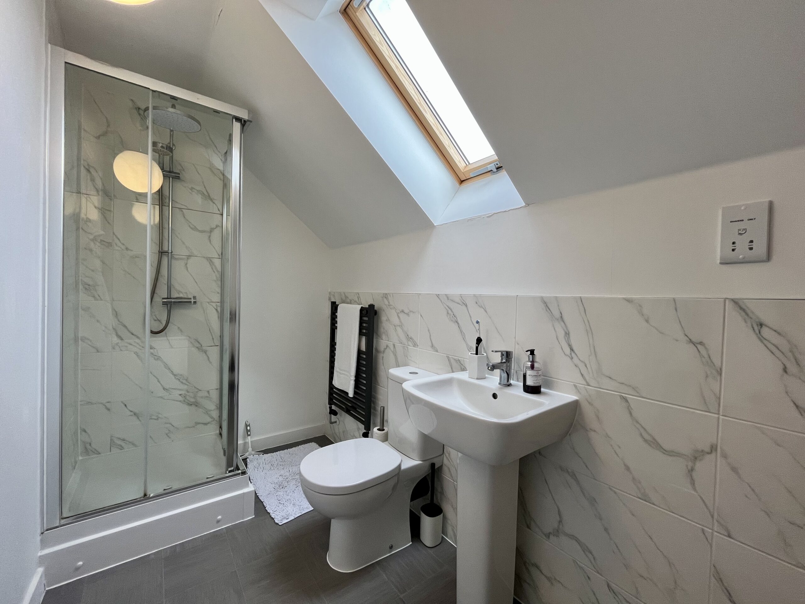 Tiled surround. Velux windows. Vinyl to floor. Extractor fan to ceiling. Radiator. Shaver points. Walk-in shower cubicle. Three piece suite comprising; WC, ceramic hand-basin and walk-in enclosed shower cubicle.