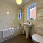 Window to side aspect. Vinyl to floor. Three piece suite comprising; WC, ceramic hand-basin and bathtub (with overhead shower attachments) with tiled surround.