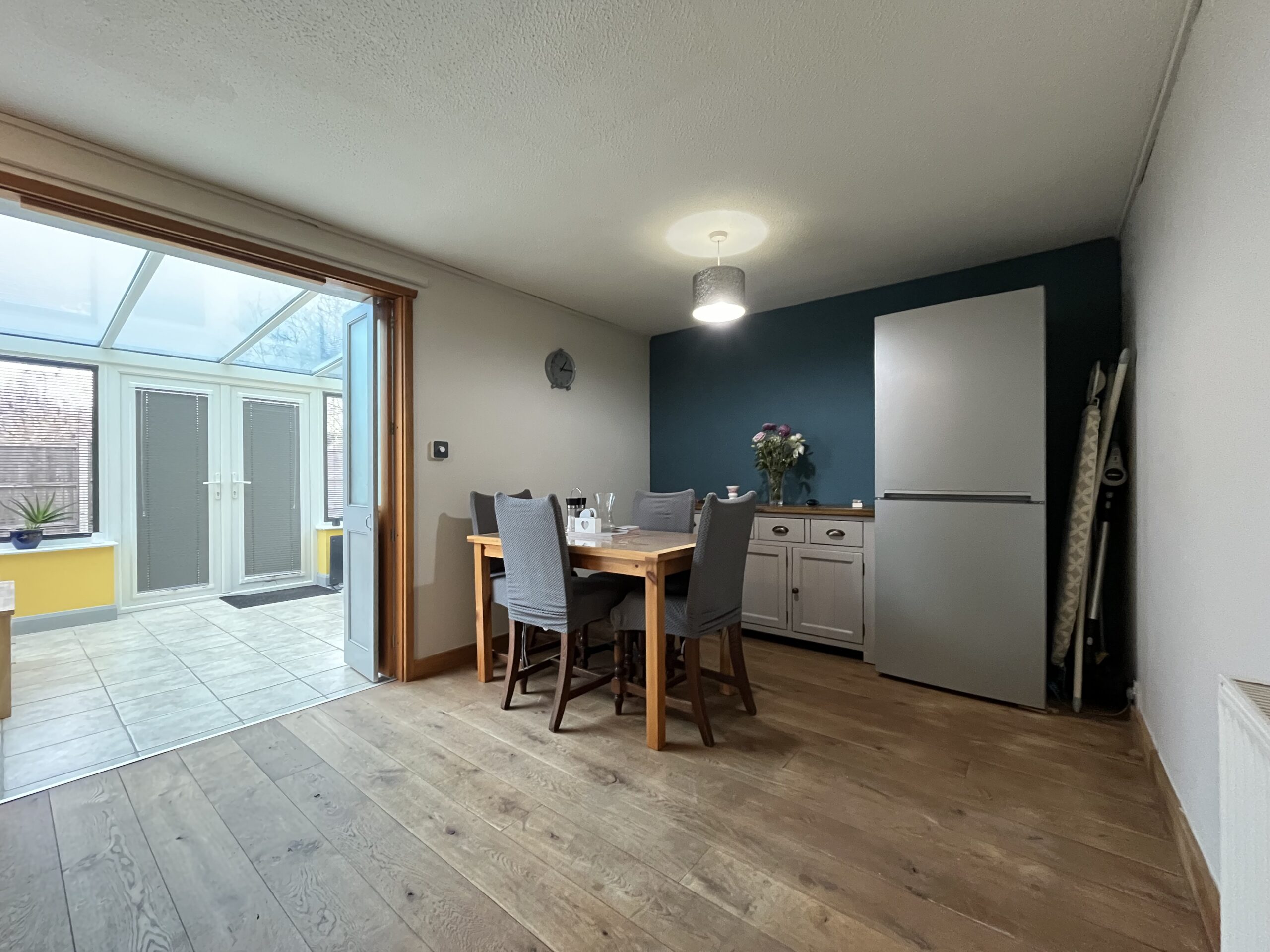 Fitted with a matching range of base and eye level units with worktop space over. French doors to conservatory. Space for washing machine. Space for fridge freezer. Oak wooden flooring. Radiator.