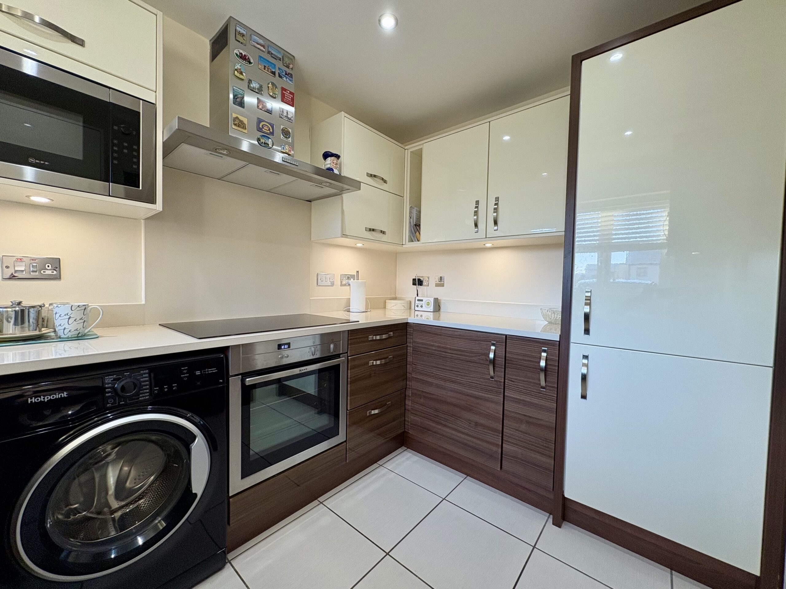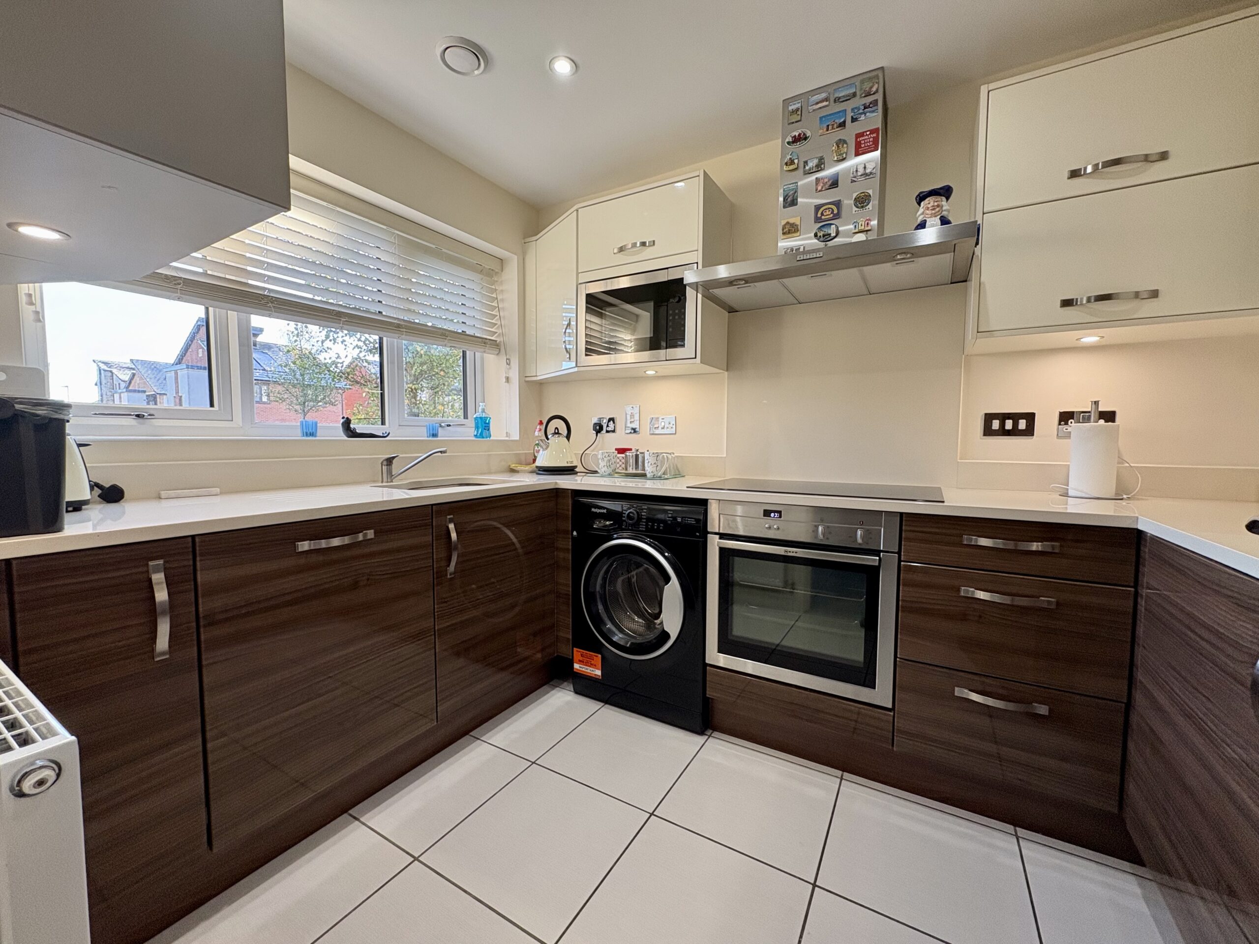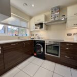 Tiled flooring. Window to front. Upgraded fitted kitchen including; Matching range of base and eye level units with granite worktops over. Induction hob with triple extractor unit over and electric single oven. Selection of chrome sockets. Integrated appliances include; Dishwasher, washing machine and fridge/freezer.