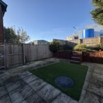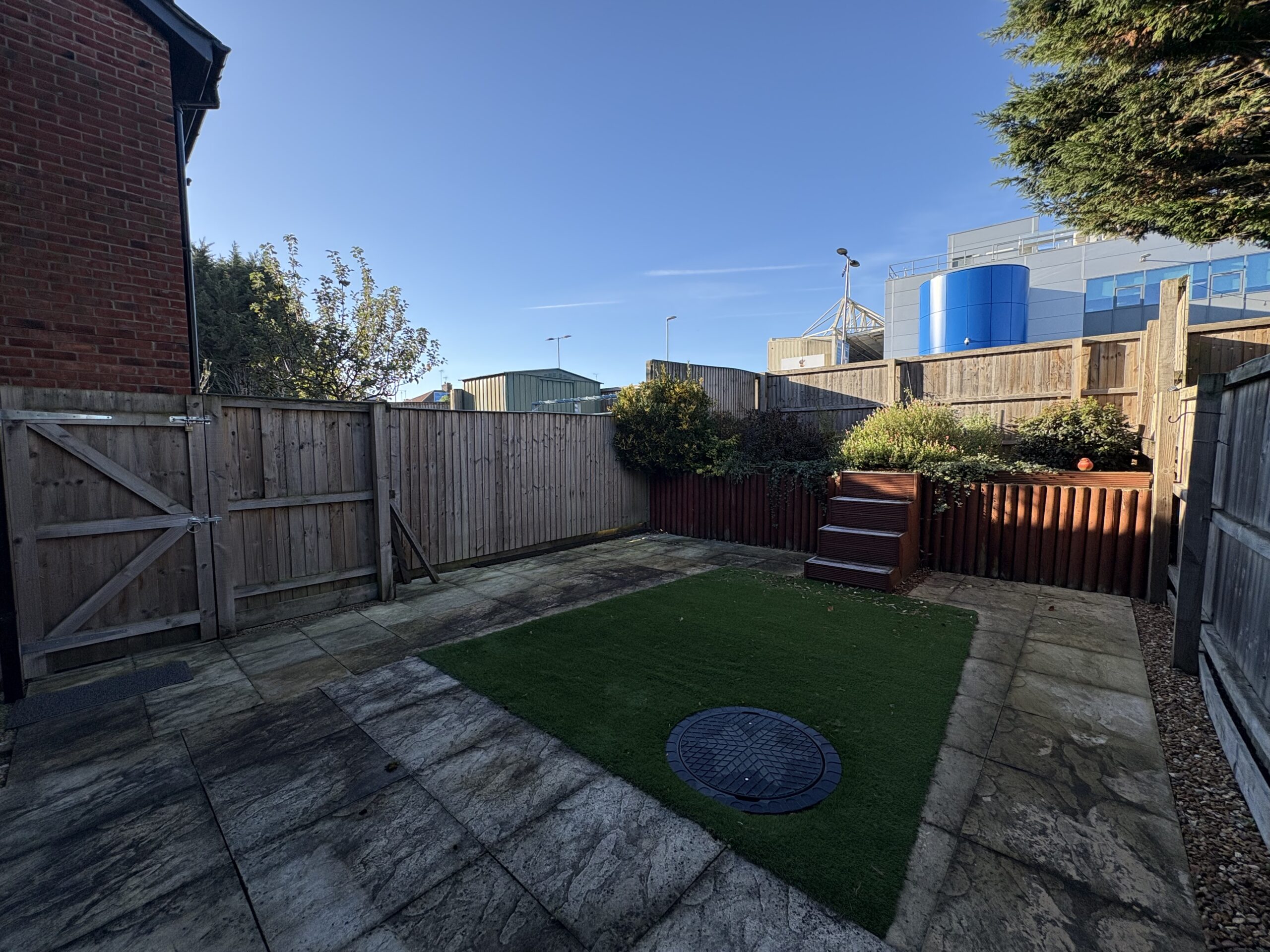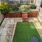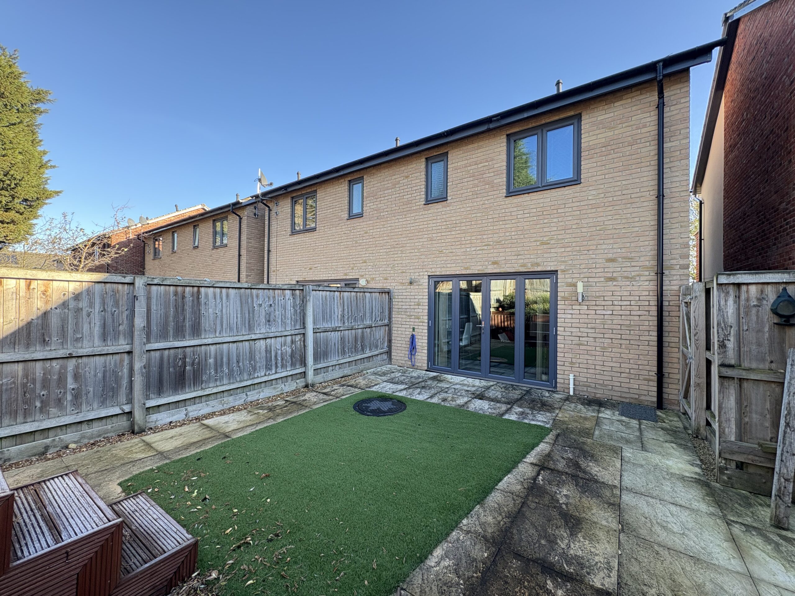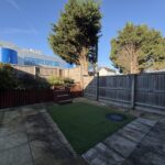 To the rear is a complete landscaped garden area with a raised area. The lower garden is mainly patio with an area of artificial turf. Side gate leading to front garden. Outside tap and external lighting. To the front is an area of greenery and a private driveway, providing off-road parking.