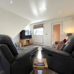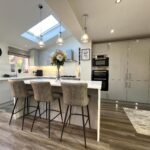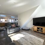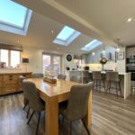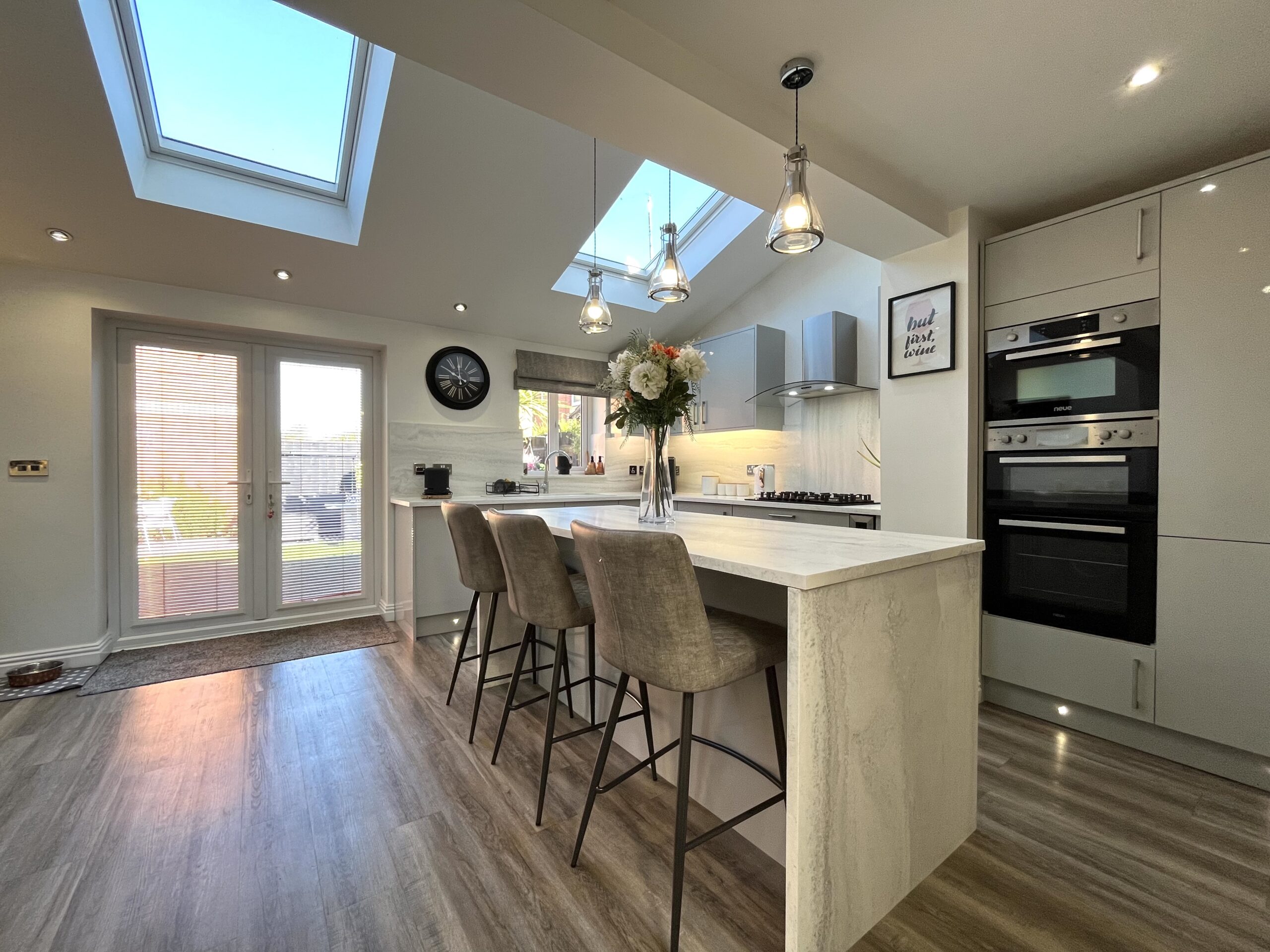 Fitted with a matching range of base and eye level units with worktop space over. Double oven. Integrated microwave. Built in appliances such as Fridge/freezer, dishwasher & wine cooler. Three velux windows. Breakfast bar. Stairs leading to first floor and doors leading to;