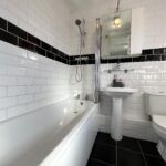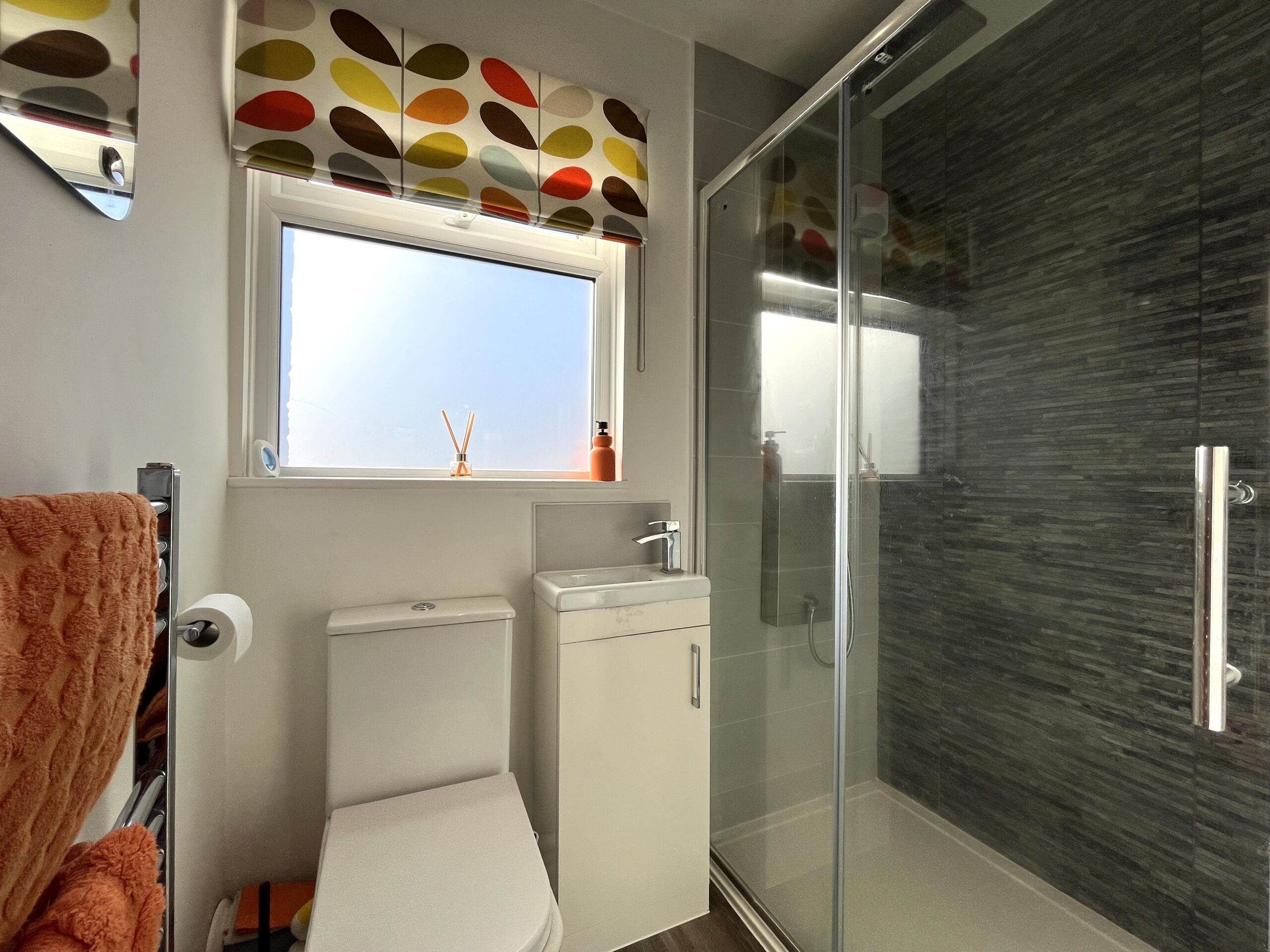 Three piece suite comprising; Cubicle shower. WC & Wash handbasin. Window to front aspect and heated towel rail.