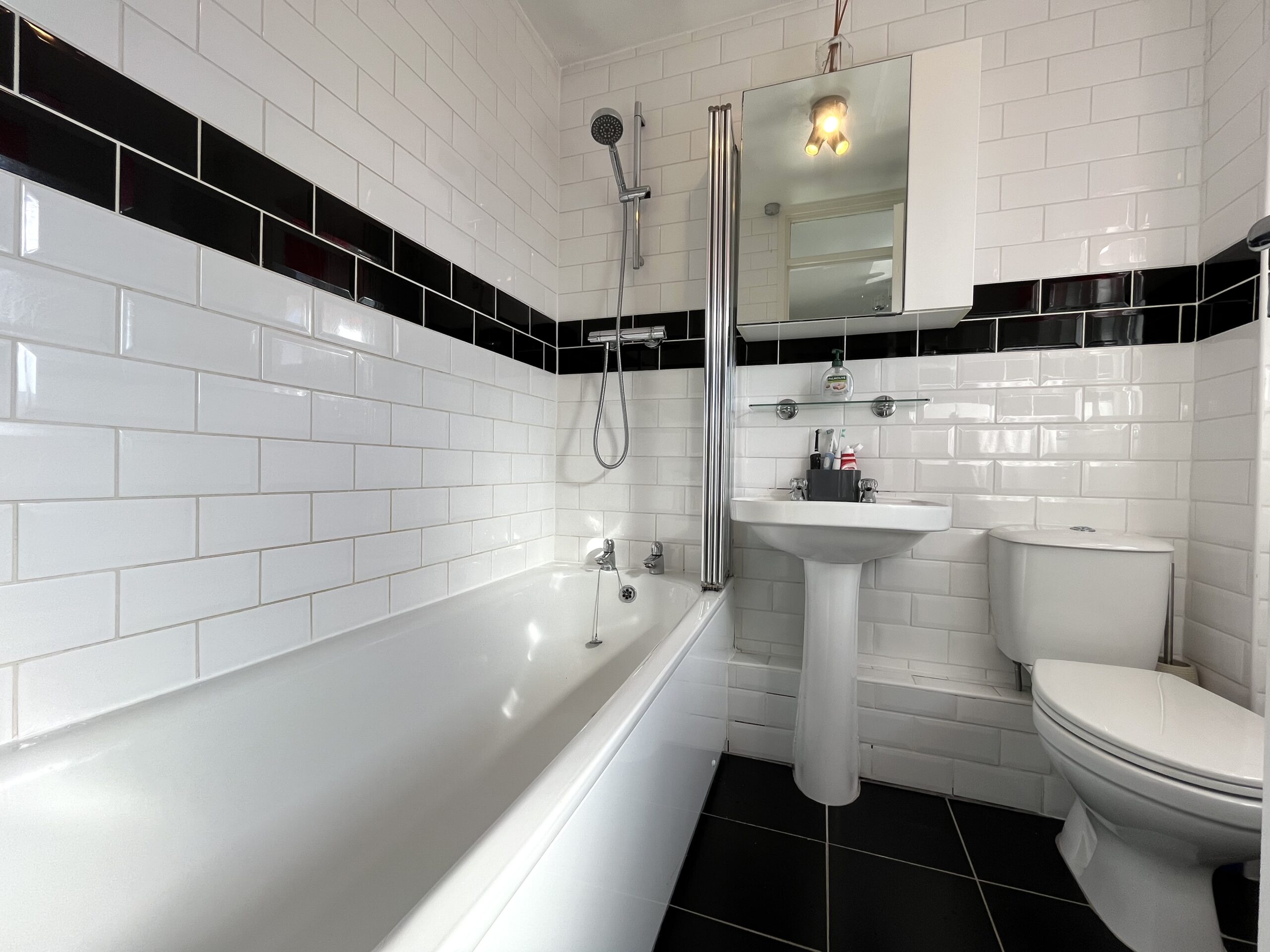 Three piece suite comprising; Bathtub with shower attachment over. WC & Wash handbasin. Heated towel rail. Window to front aspect. Airing cupboard. Full tile surround.