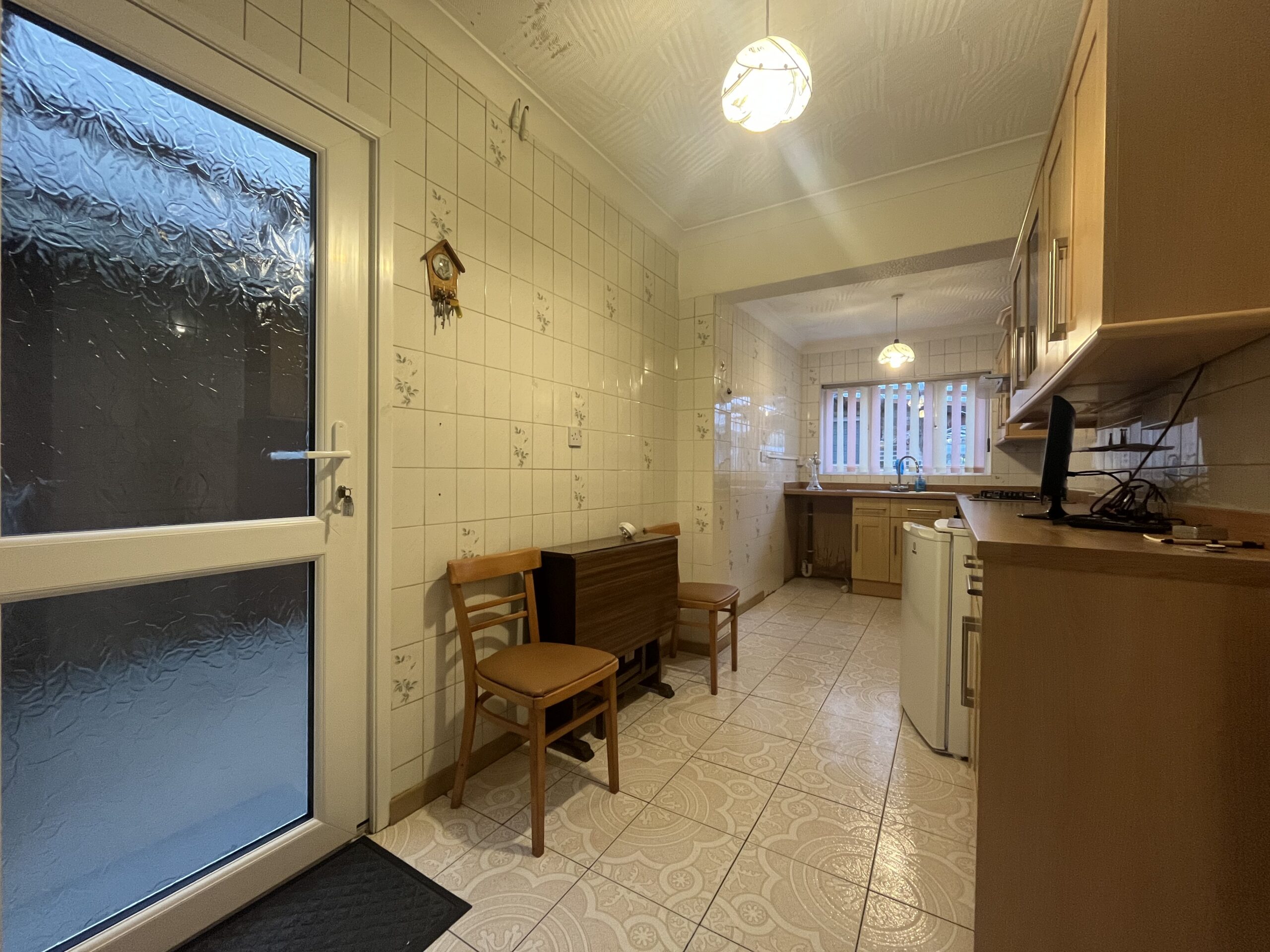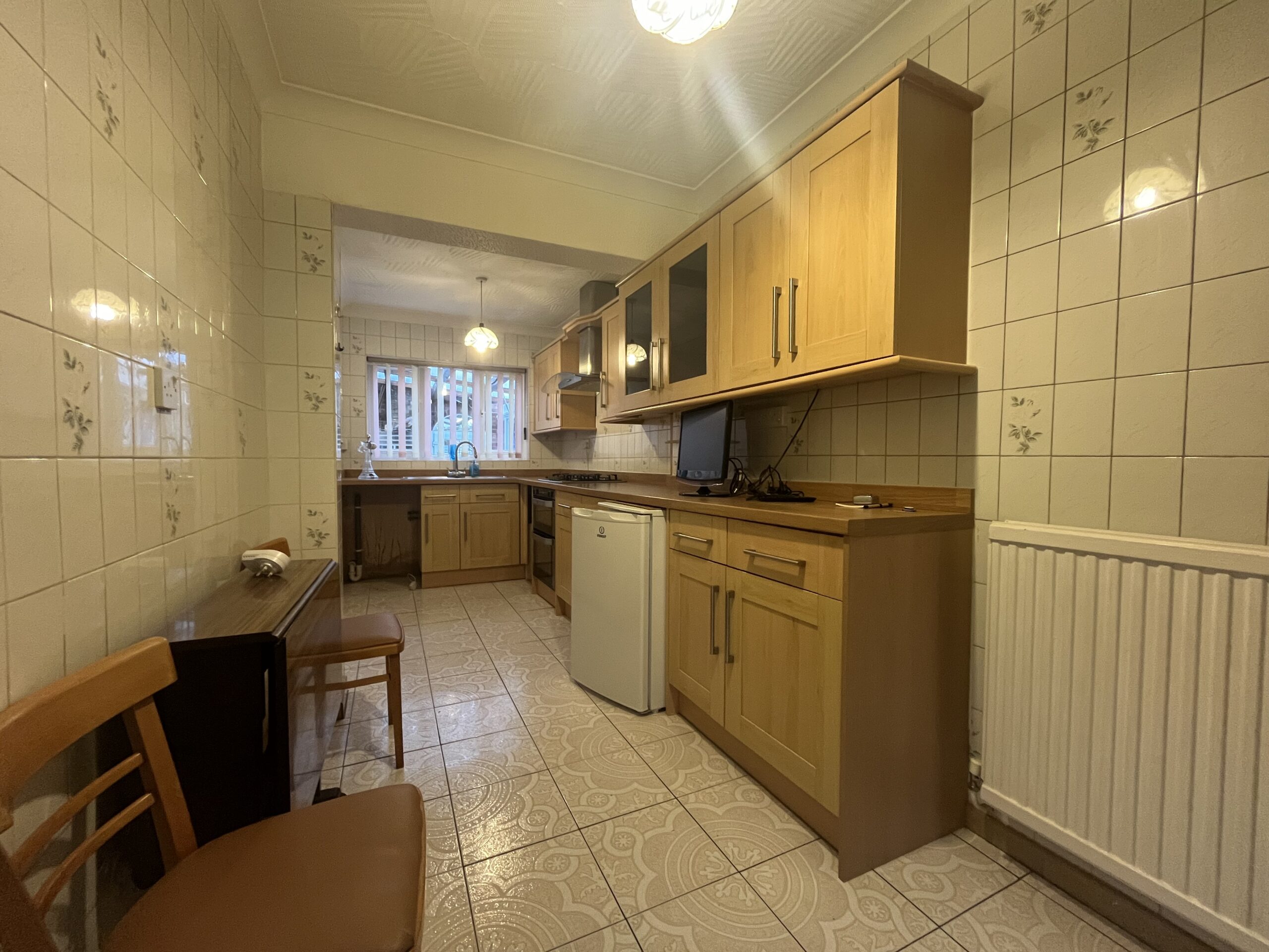 Fitted with a matching range of base and eye level units with worktop space over. Space for washing machine. Space for fridge. Electric oven with four ring gas hob. Window to rear aspect. Radiator. Tiled flooring.