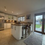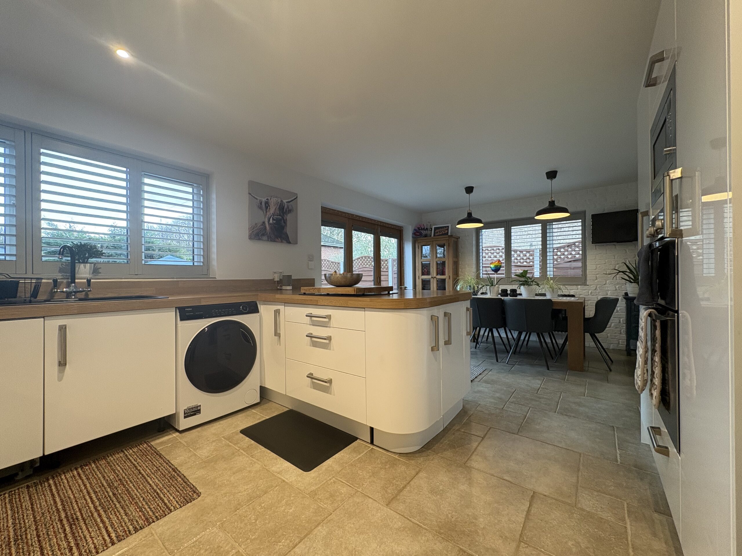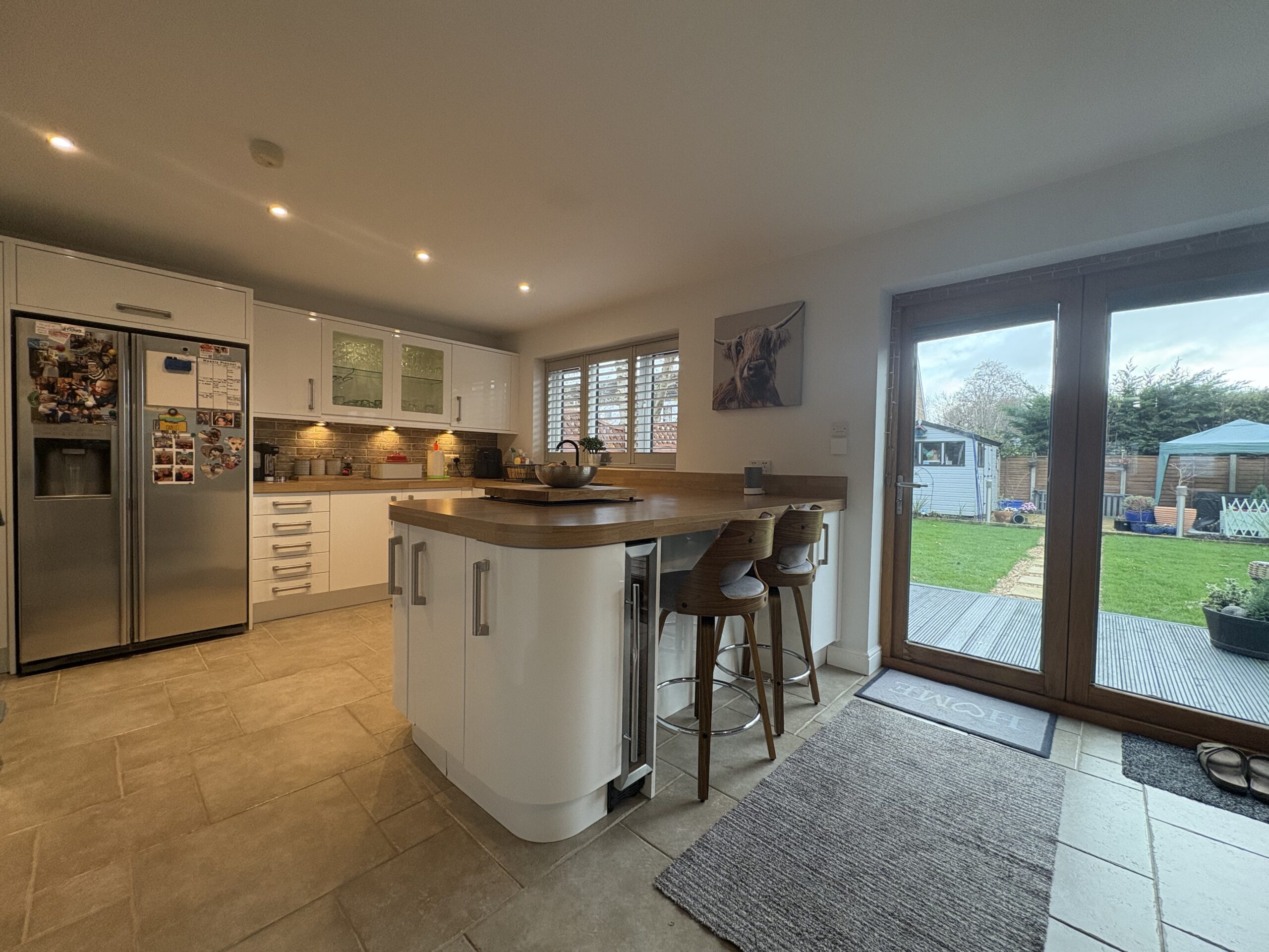 Fitted with a matching range of base and eye level units with worktop space over. Space for American fridge/freezer. Space for washing machine. Built in dishwasher. Wine cooler. Breakfast bar. Bifold doors to garden. Window to rear & side aspect. Radiator. Tiled flooring.