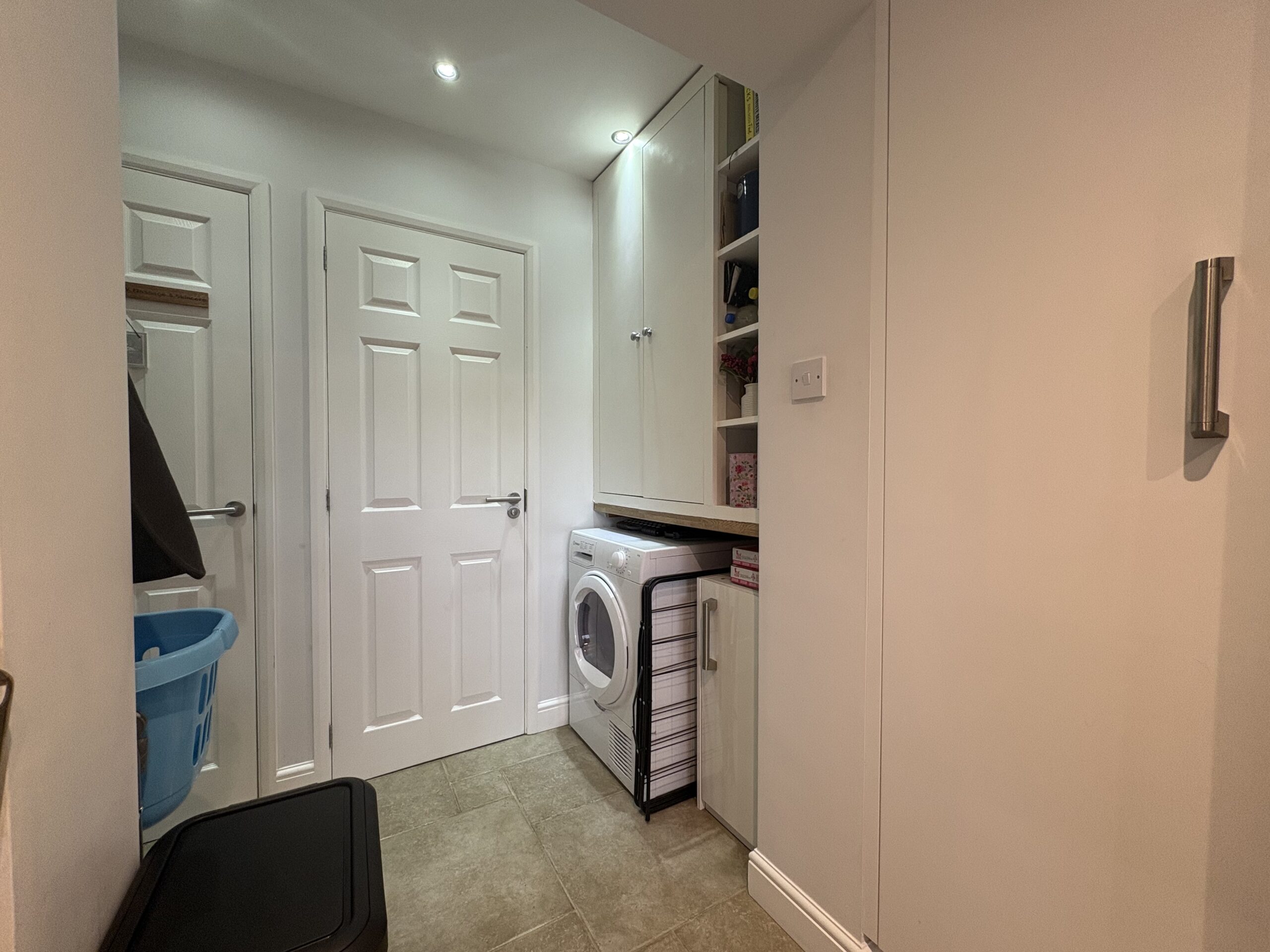 Tiled flooring. Space for Tumble Dryer. Built in storage.