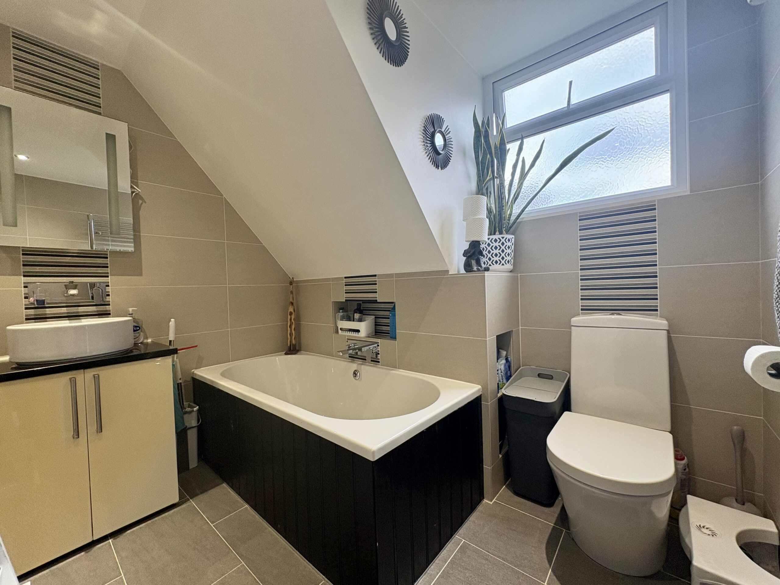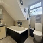 Four piece suite comprising; Bathtub. Shower. WC & Wash handbasin. Full tile surround. Window to rear aspect. Tiled flooring. Heated towel rail.