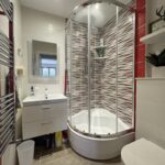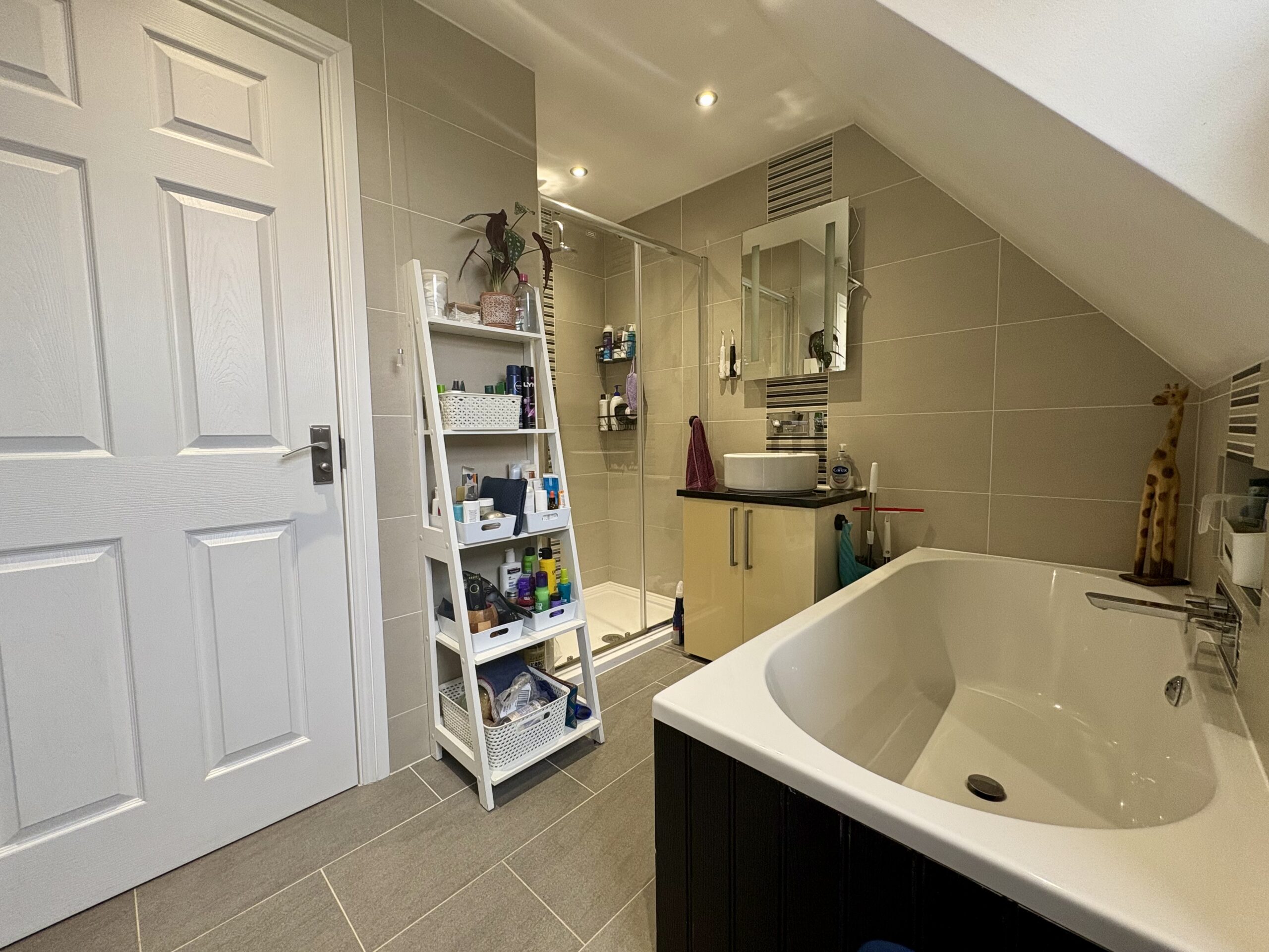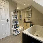 Three piece suite comprising; Closed corner shower. Tile surround. Wash hand basin & WC. Heated towel rail. Storage.