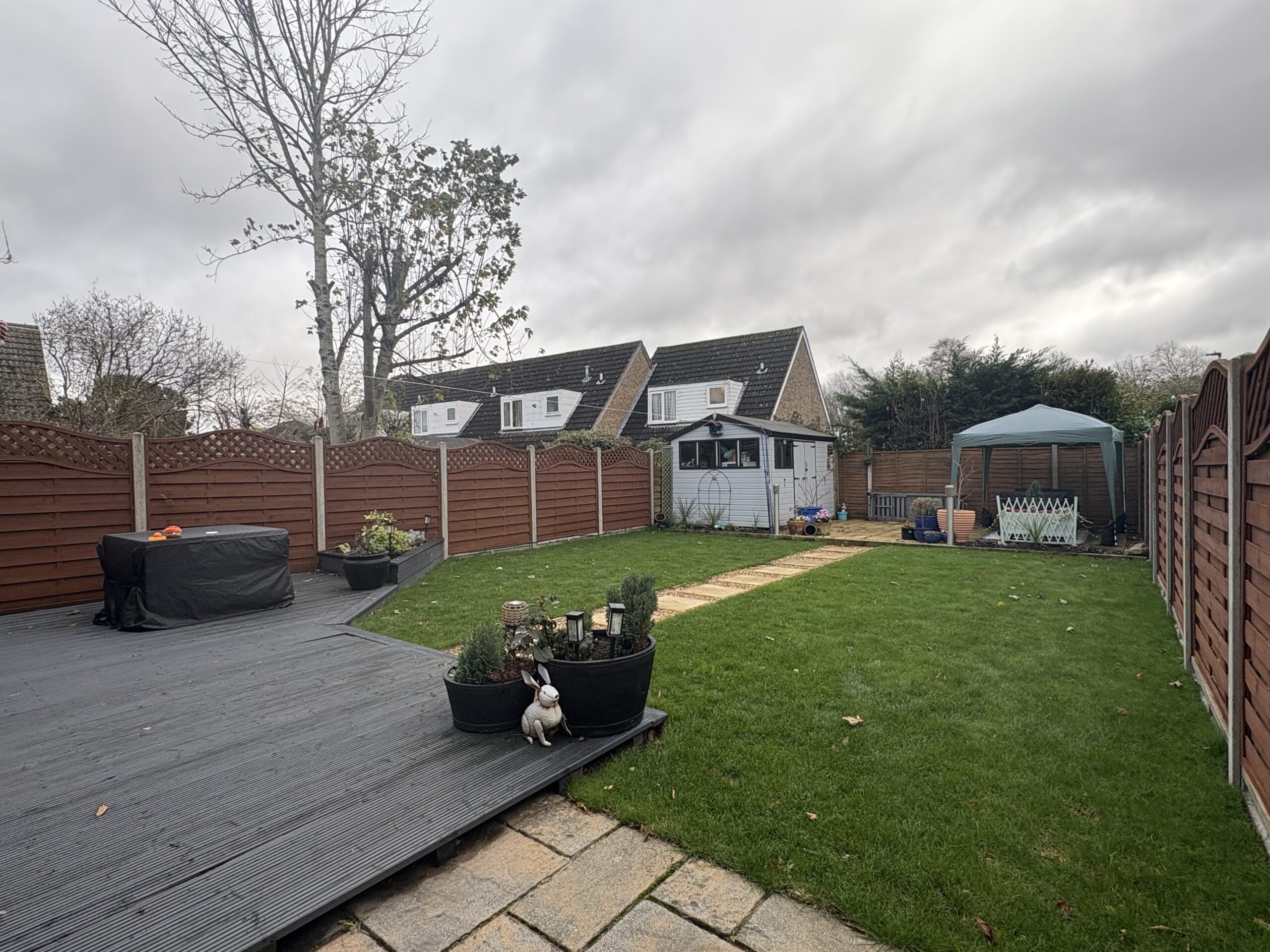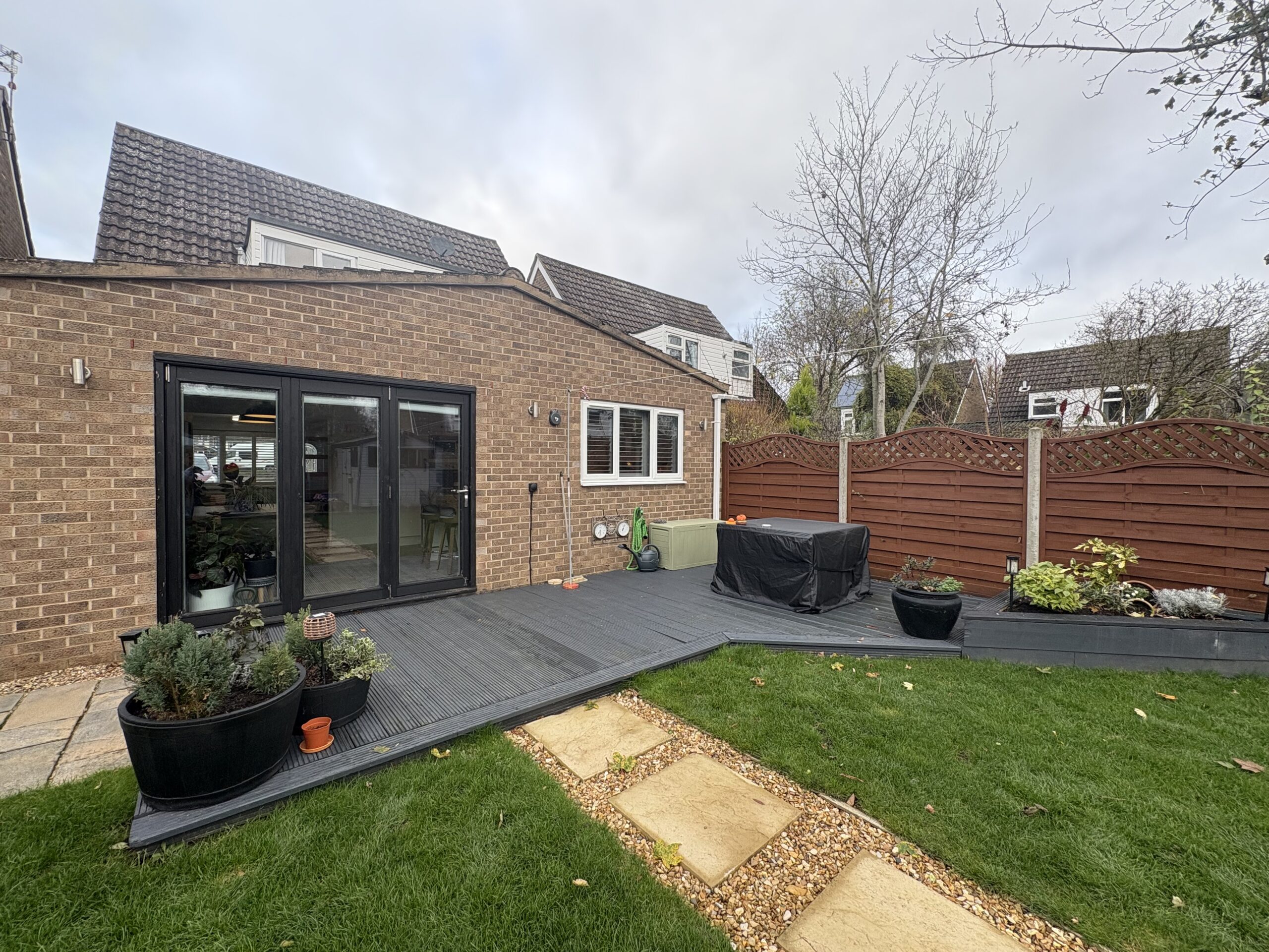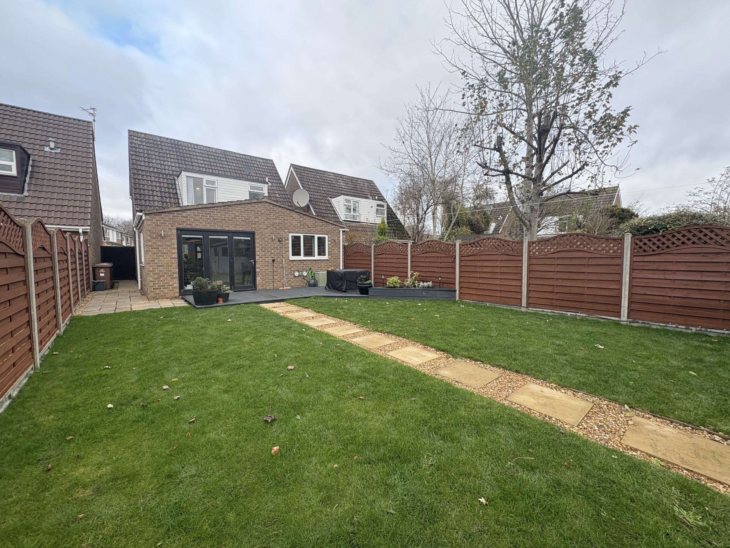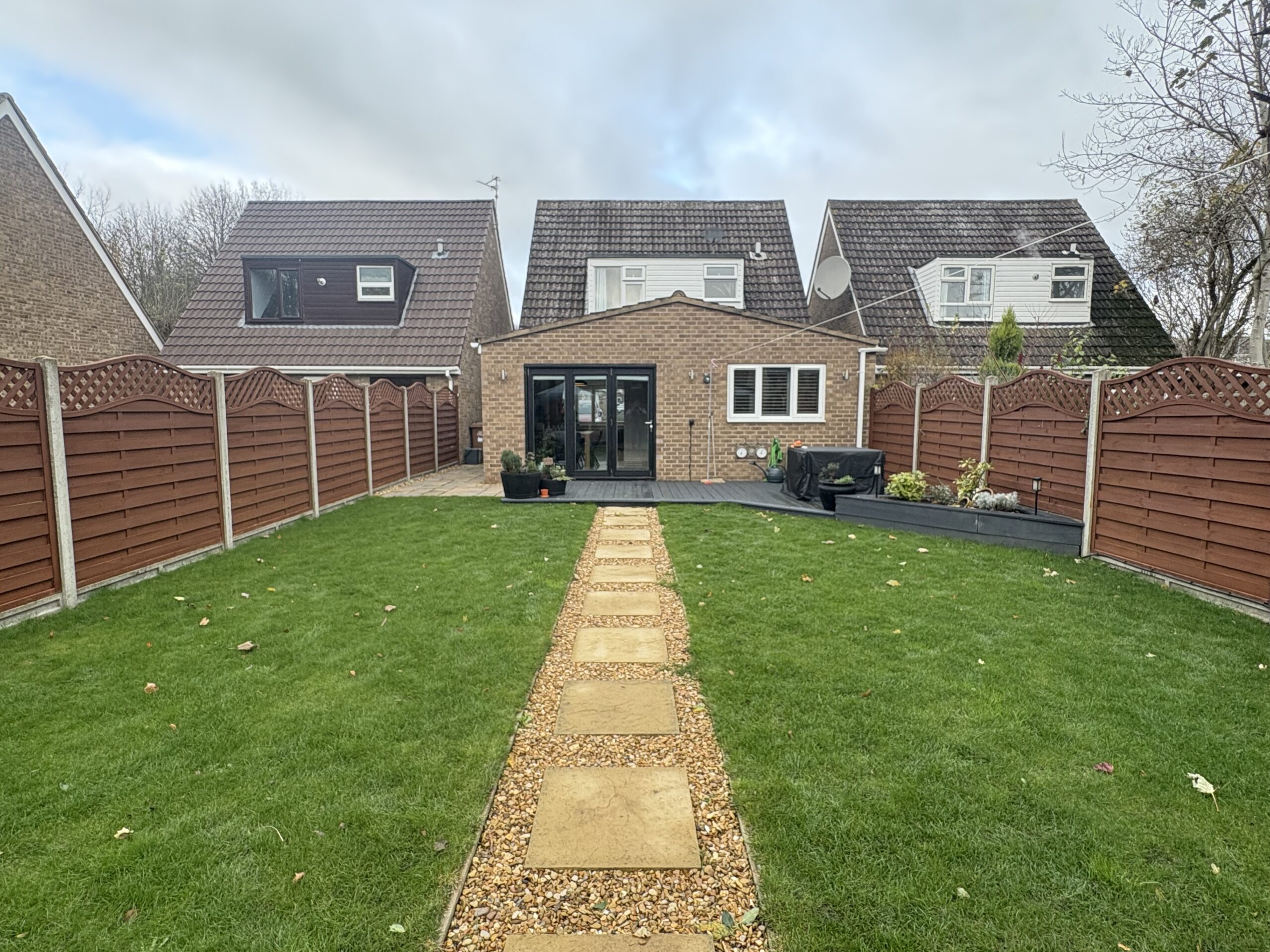 The front of the property provides driveway parking for three vehicles and side gate access to rear garden. The rear garden has been landscaped and is sectioned off from Lawn, decking and a pathway leading to a patio area to the bottom.