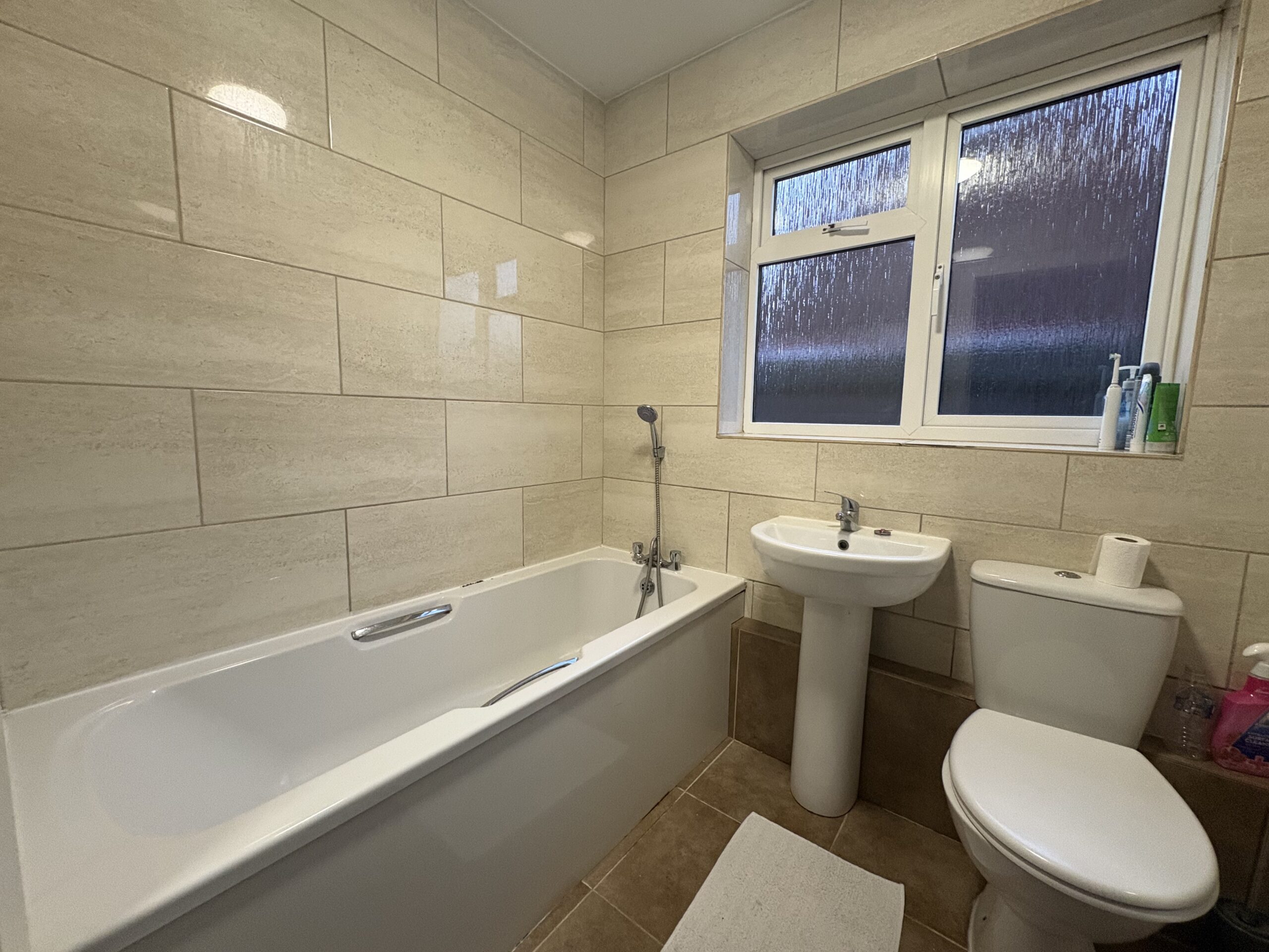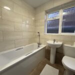 Three piece suite comprising; Bathtub with shower attachment over. Wash handbasin & WC. Tiled flooring. Full tile surround. Window to side aspect. Radiator. Extractor hood.