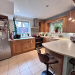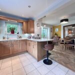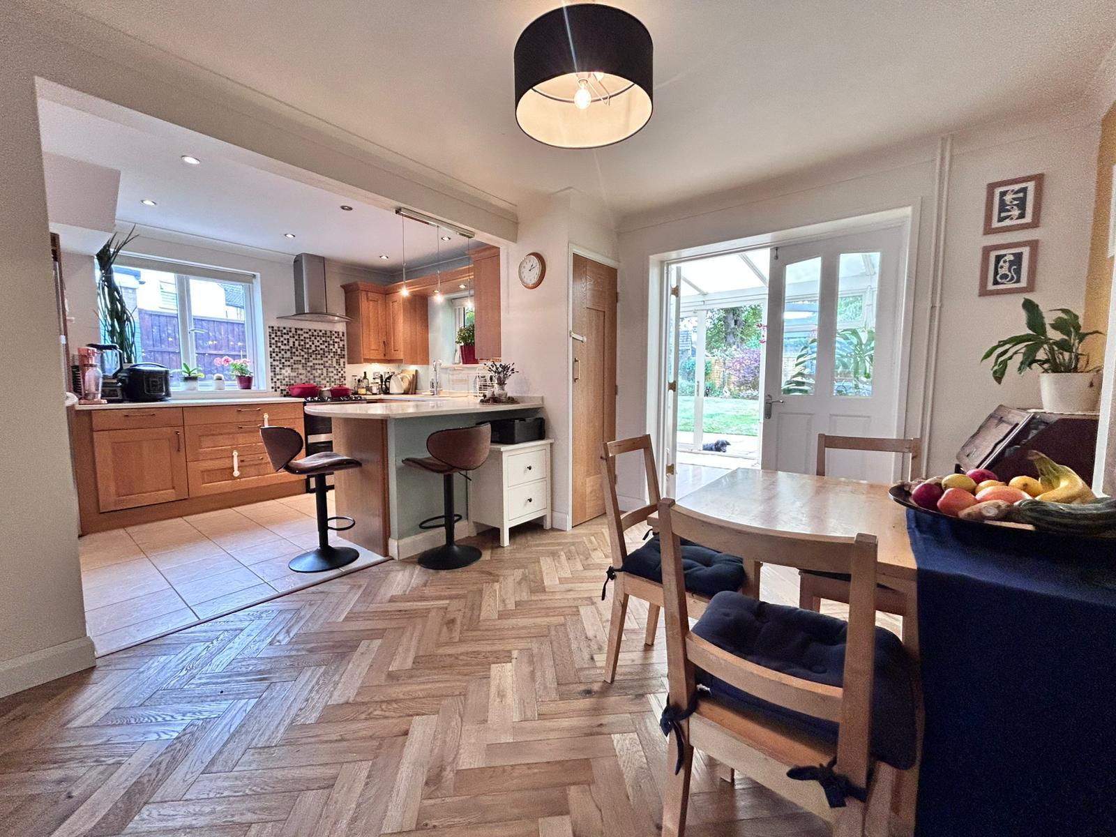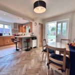 Fitted with a matching range of base and eye level units with worktop space over. Breakfast bar. Space for fridge/freezer. Windows to side & rear aspect. Tiled flooring to kitchen. Herringbone flooring to dining room. Doors leading to;
