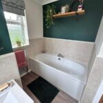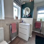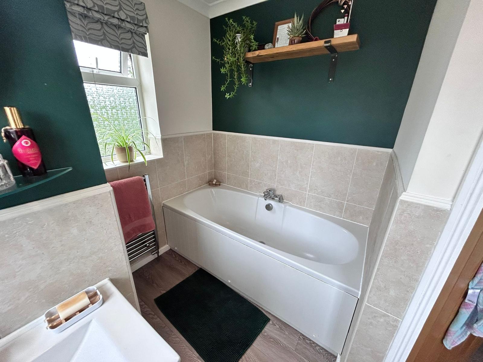 Four piece suite comprising Bathtub. Closed corner shower. WC & Wash handbasin. Part tile surround. Window to rear & side aspect. Laminate flooring. Two heated towel rails.